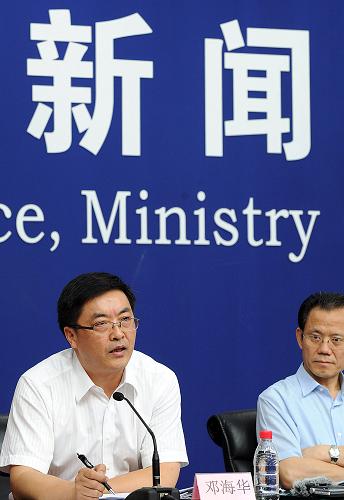 8月13日,衛生部新聞發言人鄧海華(左)在回答記者提問。8月13日,在衛生部舉行的例行新聞發布會上,衛生部食品安全與衛生監督局局長蘇志介紹,《預包裝食品營養標簽通則》將于2013年1月1日正式施行,這標志著我國全面推行食品營養標簽管理制度,對指導公眾合理選擇食品,促進膳食營養平衡,降低慢性非傳染性疾病風險具有重要意義。新華社記者 何俊昌 攝